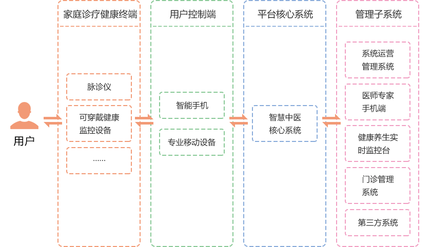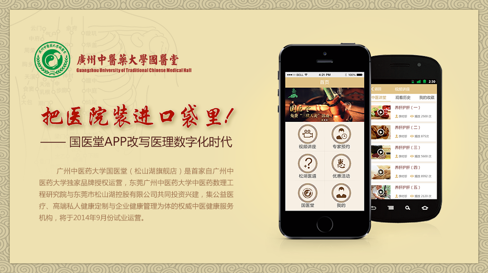 采用先进的移动互联网、云计算、物联网、大数据分析、各种传感器等技术结合国医堂中医药医疗健康资源,建设一个以中医药为核心的集中医产品理论宣传推广、远程诊疗辅助、健康养生实时监控智慧分析于一体的“智慧中医平台”,为用户提供零距离贴身的高体验的中医药治疗健康养生服务。