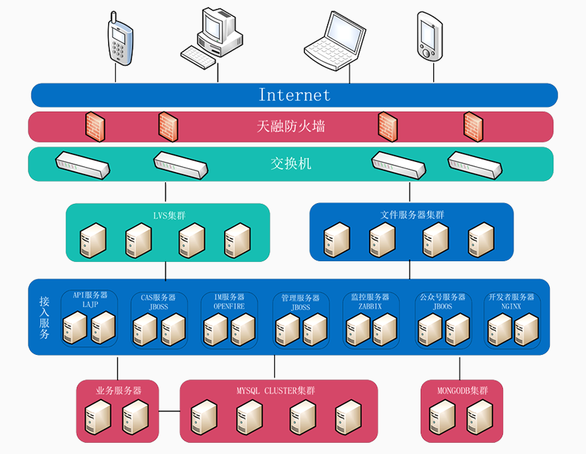 系统分层设计,分离接入服务与业务服务,层层负载,采用MYSQL集群方案,减少数据访问瓶颈。采用CACHE机制减轻IO与数据压力。保证系统安全,高效,稳定的运行。