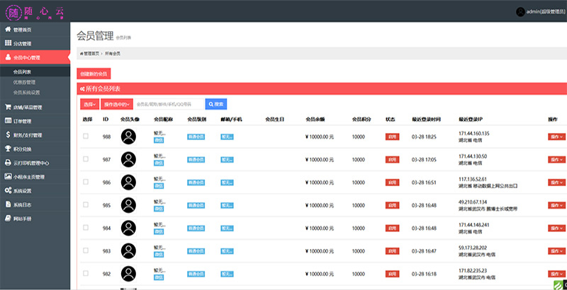 通过会员注册,手机会员昵称、手机号码、生日等信息,后台可管理会员余额、积分,修改会员信息等;会员储值优惠、余额支付、优惠券等可有效帮助商家提高用户留存率。