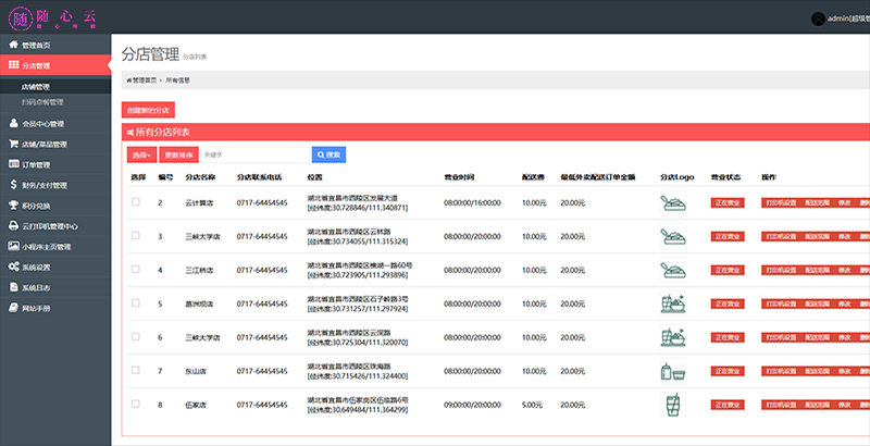 在随心云智慧小程序点餐中,总部可开设多家连锁分店,总部可设置分店地址、分店配送范围设置、营业时间、打印机等。