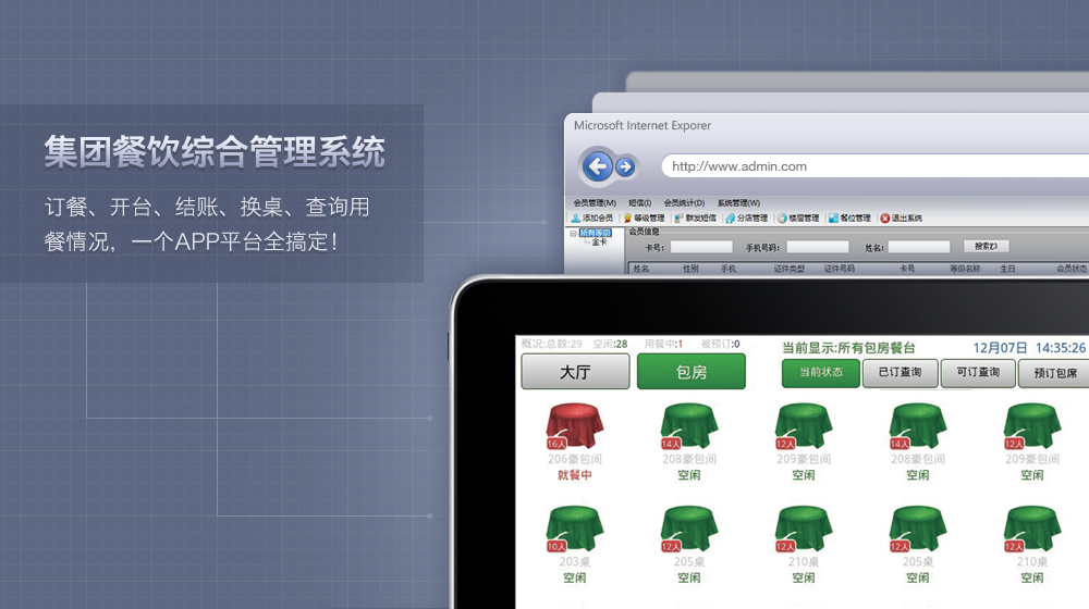 该系统根据目前集团餐饮行业的需求,开发出一套移动终端APP(包括手机、平板)餐厅管理系统。可以通过APP平台订餐、开台、结账、换桌、查询用餐情况等等。其中订餐可分为批量订餐和单订。可以通过手机实时查看餐厅所有的预订和运营。能满足餐饮集团举办大型公众活动时对系统的要求。支持集团各门店数据共享,为餐饮企业开源节流,提高营业额,提升品牌形象移动终端清晰报表,随时随地了解经营情况,调整经营策略。